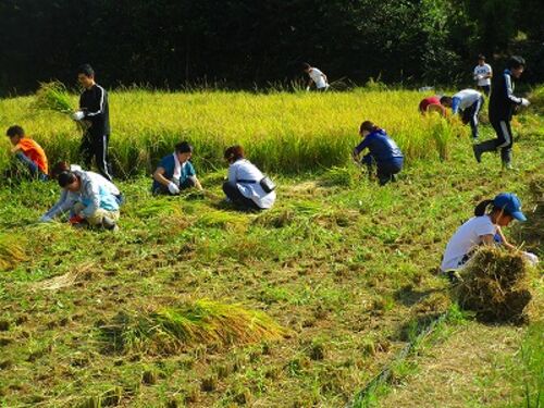 もちつき大会で,使用するもち米の稲刈りを行いました。 稲刈りは午前の予定でしたが,雨が残っていたので午後に行いました。 大きな台風がありましたが,例年のように育っていました。 職員,PTA役員,純情クラブ,PTA役員や純情クラブの方のお子さん…