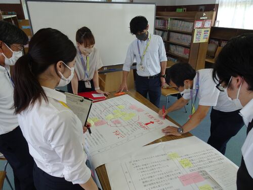 子どもたちの下校後、今度は先生が勉強です。タブレット端末の有効な使い方について、子どもたちの対話のつくり方について話し合いました。先生たちもよい授業に向けて、日々悩み、勉強しています。