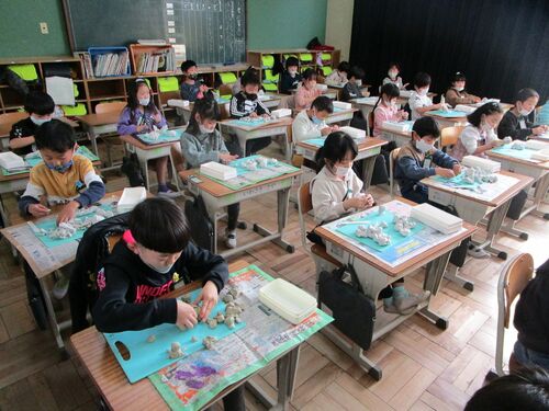 1年生は図工で粘土をやりました。 ゆきだるまとお散歩したり、動物とお散歩したり楽しそうな様子です。 みんな楽しそうに作っていました。