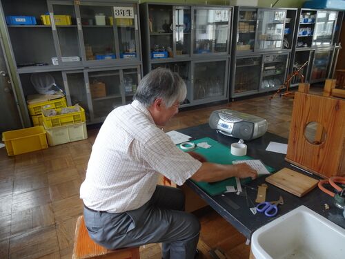 誰もいないはずの理科室。何かをやっている人影が……。 理科室の片付け、掲示物や展示物の整備を行っていました。 化石などの展示コーナーもすっきりとして、とてもいい感じです。 完成まで間近です。