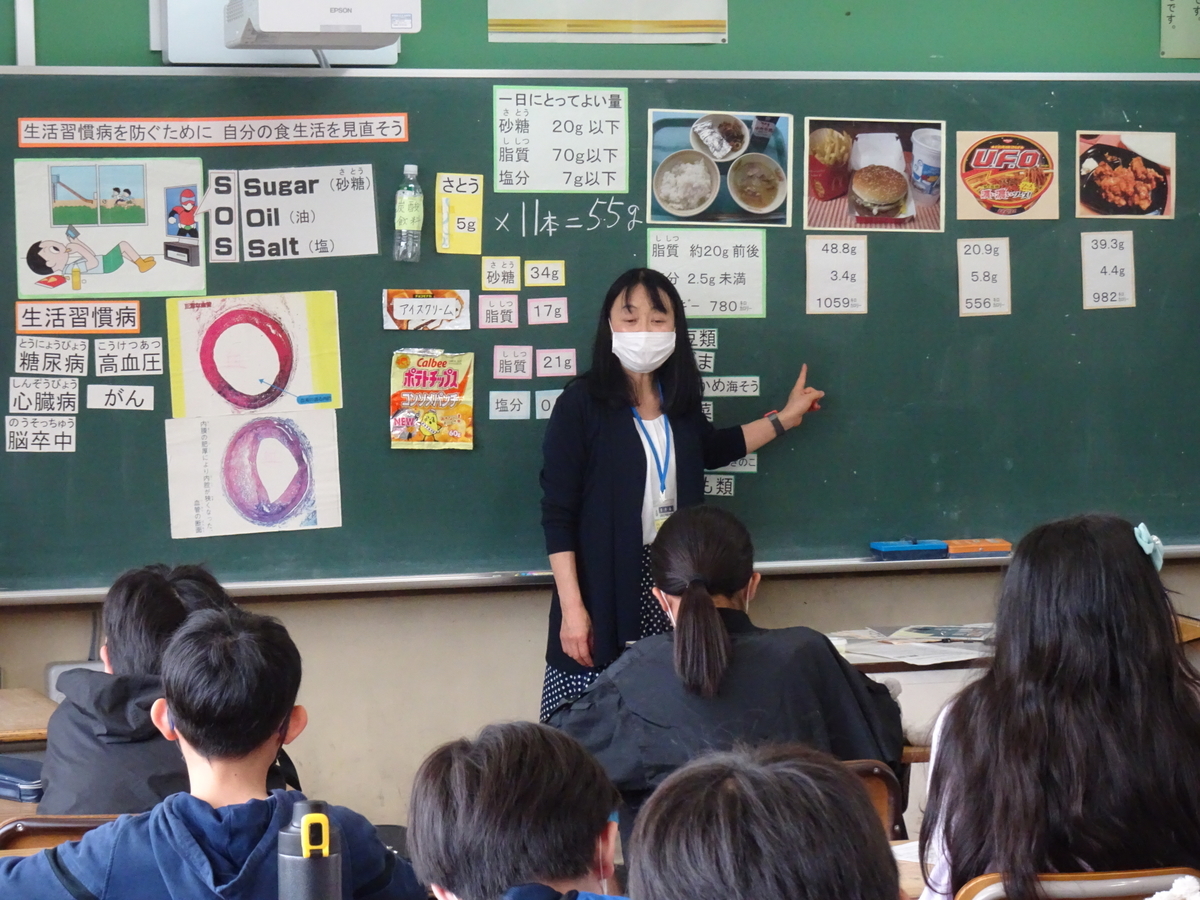 2022-05-12 5/12 6年学活 給食指導 今週から1学級ずつ栄養教諭による給食指導が始まりました。6年生は日頃のおやつや食事を振り返り、生活習慣病を防ぐ方法について考えました。「やばい!おやつ、食べ過ぎだ」「何を食べるかよく考えた方がいいかも」「お菓子の袋の裏を確認しよう」など、自分自身の食生活をしっかりと振り返りました。