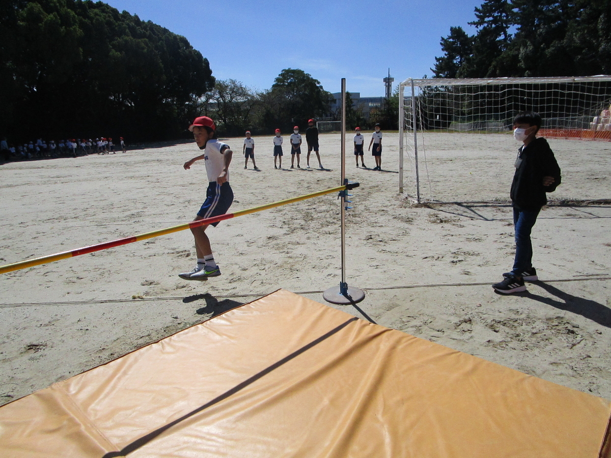 2022-10-11 10/11 6年生 走り高跳び 6年生は体育で走り高跳びの練習をしています。 今日はよい天気の中6年2組が運動場で練習をしていました。 さすが6年生なかなかの高さを跳んでいました。