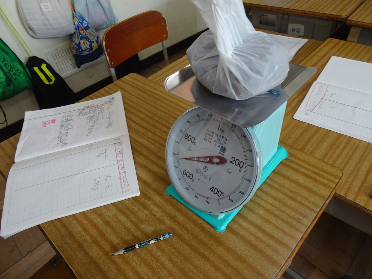 2023-10-12 10/12 3年 算数 重さ 重さの単位について学習した3年生。 今日は、実際に「1㎏」をビニール袋に砂を入れて作ってみます。 「少し多かった~」「全然、足りないよ!」 はかりの目盛りをよむ子どもたちの目が真剣です。