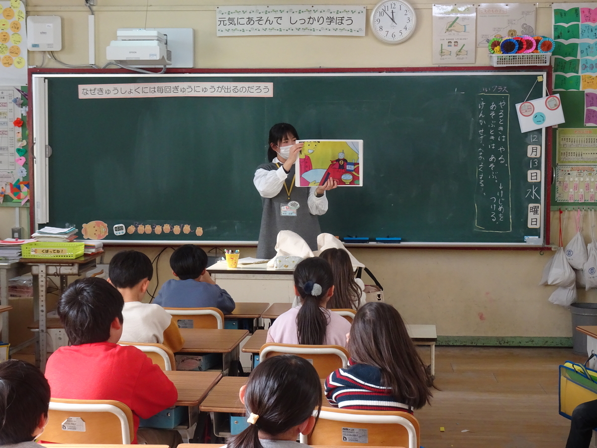 牛乳のすばらしさについて、紙芝居を見たり栄養のお話を聞いたりしました。