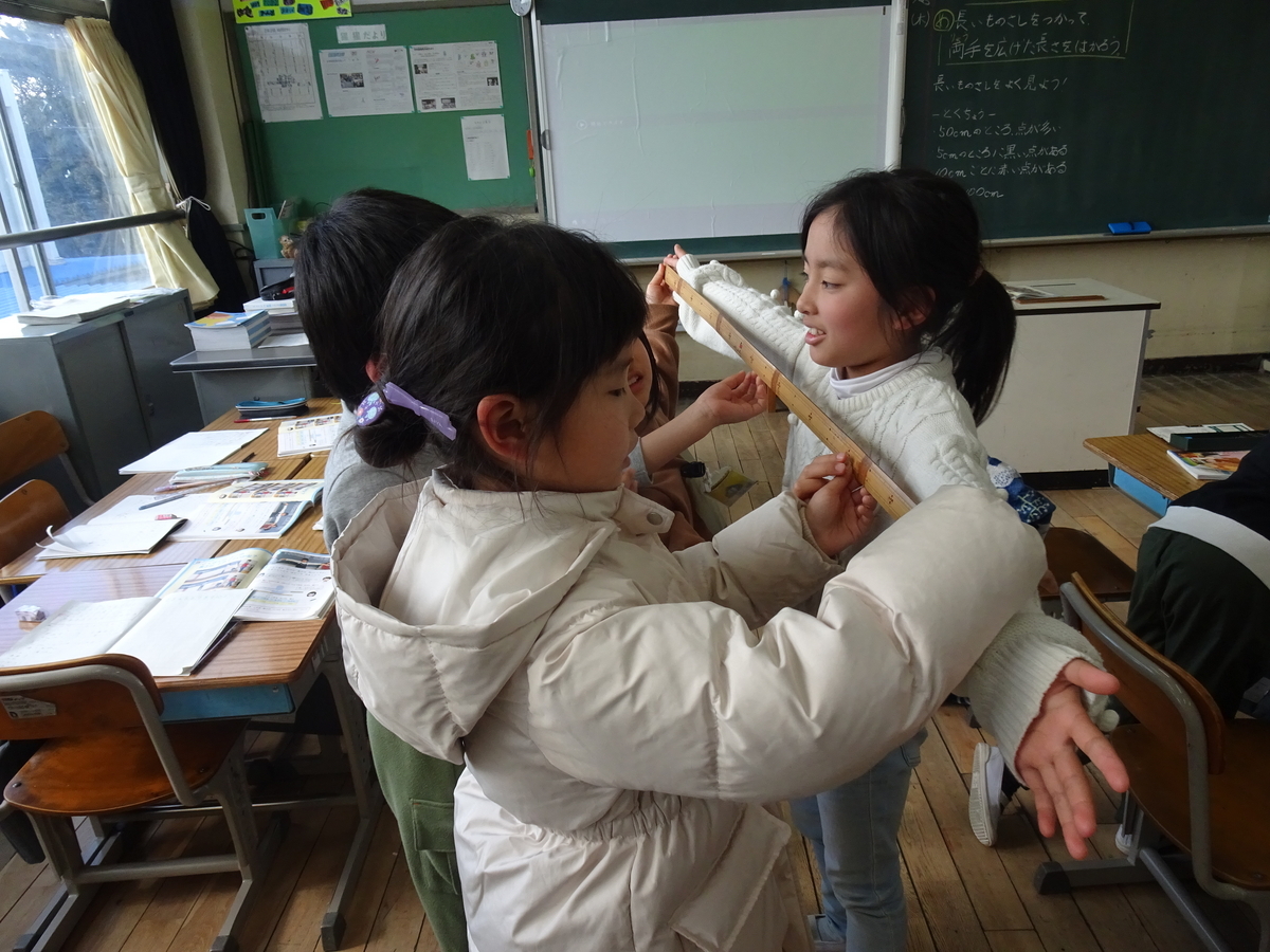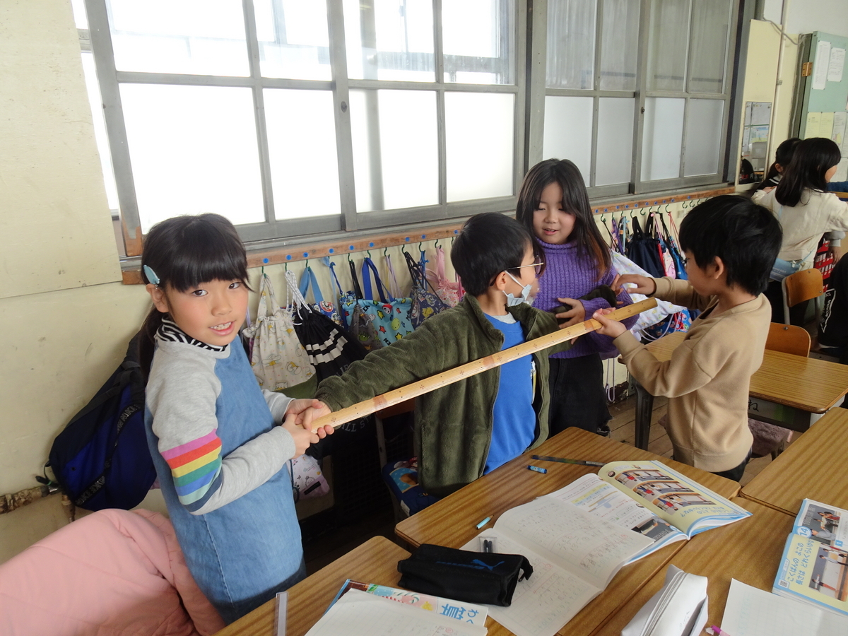 2024-01-25 1/25 2年 算数 100㎝をこえる長さ これまでに長さの単位「㎝」を学習した2年生。 これからは、もう少し長い長さの学習です。 手を広げたときの右手から左手までの長さを1mものさしではかってみました。 竹のものさしなので、数字が書いてありません。 しっかり測れたかな?