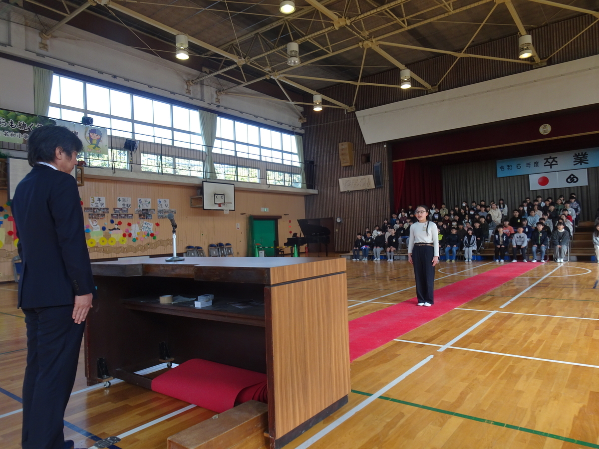 2025-03-18 3/18 6年 同窓会入会式 卒業式の前日、毎年、同窓会の入会式が行われます。 120年の歴史がある名和小は、10,000人を超える卒業生がいます。 6年生は、その仲間入りをします。