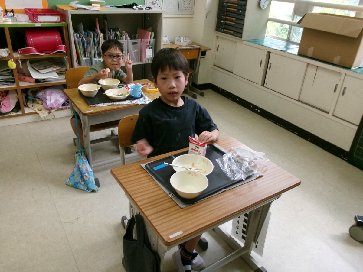 2025-09-29 今日の給食 本日の献立は、サンドイッチバンズパン、牛乳、ハンバーグのケチャップソースかけ、やさいソテー、きのこのクリームスープでした。ハンバーグをパンに挟んで、ハンバーガーにして食べました。