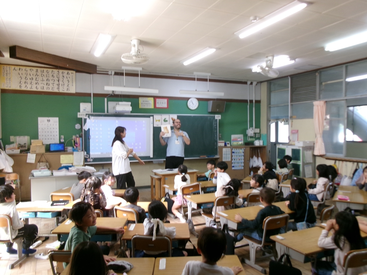2025-10-27 1年生:外国語活動 1年生が外国語活動を行なっていました。担任とALTが協力して授業を進めています。今日は、動物の名前を学んでいました。動物の絵が描かれたカードの1部からどんな動物なのかをあてます。そして、英語で答えます。続いて、代表の児童のジェスチャーから動物を予想し、英語で答えます。「I like ~」の文型も学んでいました。「~」に動物を入れて会話をします。とても楽しそうでした。